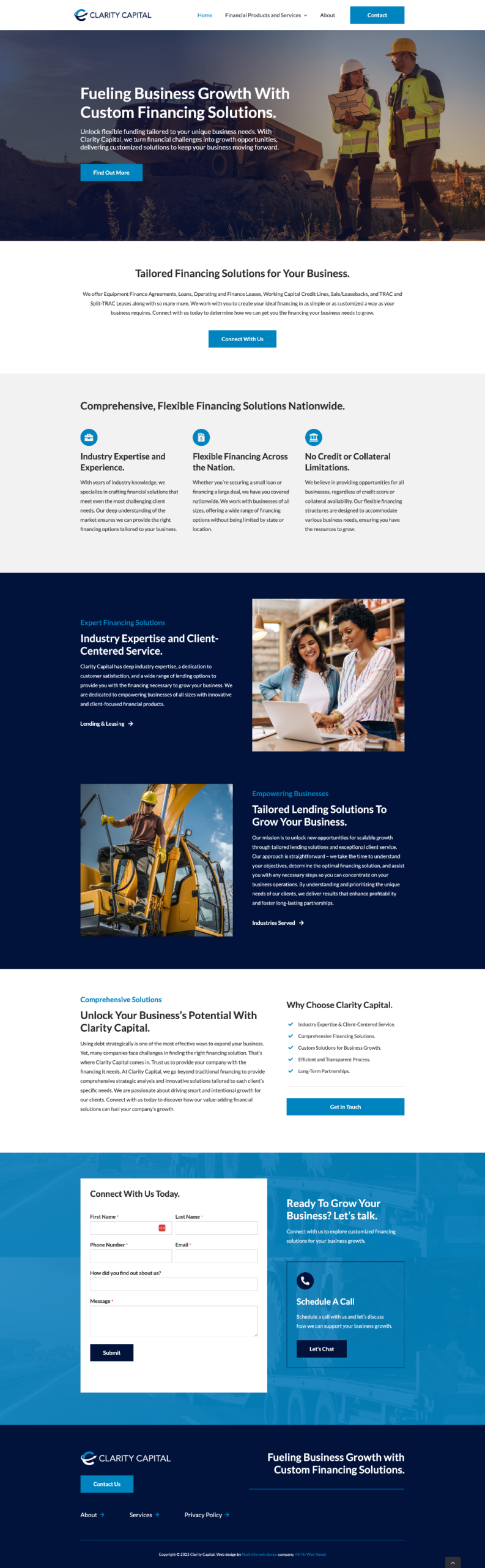 Clarity Capital is a custom-designed website built to establish credibility, trust, and professionalism for a specialized commercial lending firm. Designed with a clean, modern aesthetic and strategic use of white space, the site positions Clarity Capital as a go-to resource for complex financing solutions across industries nationwide.