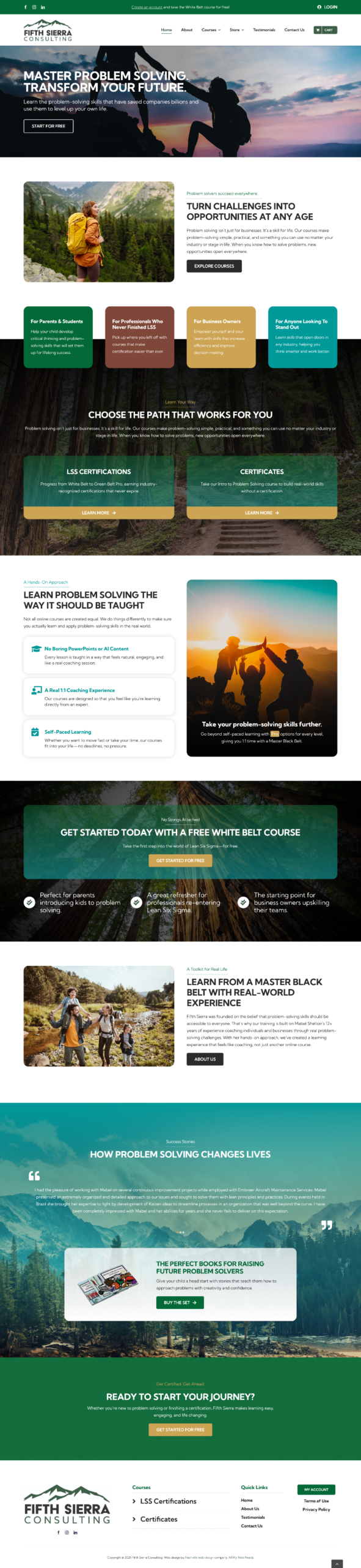 A custom website built for Fifth Sierra to transform traditional certification training into an engaging, experience-driven journey. Designed to break away from the overly corporate feel of typical certification platforms, the site introduces users to a more personal, hands-on approach to learning Lean Six Sigma through immersive storytelling, guided pathways, and a strong emphasis on real-world application. From children’s books to advanced certification courses, the platform is structured to support learners at every stage, making complex problem-solving concepts accessible, engaging, and impactful.
