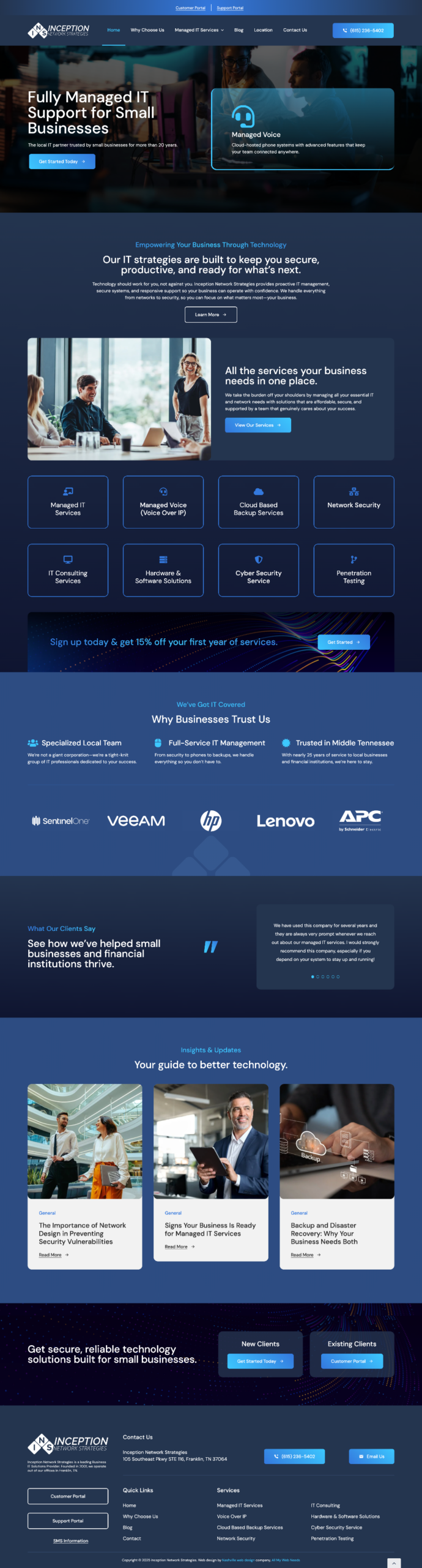 A custom website built for Inception Networks to position the company as a trusted, full-service managed IT provider for small businesses across Middle Tennessee. The site is strategically designed to clearly communicate their comprehensive service offerings, including managed IT, VoIP solutions, network security, cloud backups, and IT consulting, while emphasizing their value as a local, specialized team that handles everything from infrastructure to ongoing support. With a focus on reliability, security, and cost efficiency, the messaging highlights their ability to simplify technology and deliver measurable savings for growing businesses.