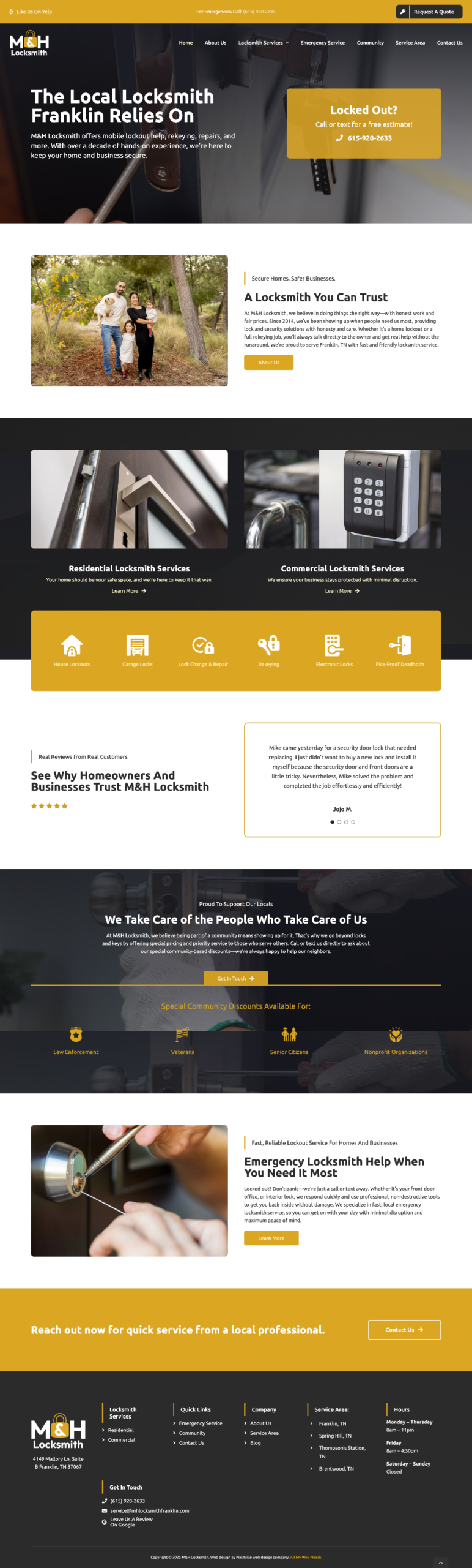 The user experience is built to drive high-intent conversions, prioritizing click-to-call and text actions for fast service requests. Trust signals such as community involvement, service discounts for seniors and first responders, and family-oriented branding are integrated throughout to build credibility and emotional connection. Supported by SEO architecture and Google Guaranteed integration, the site is optimized to increase local visibility, generate qualified leads, and position MH Locksmith as a dependable, community-focused provider in the Nashville market.